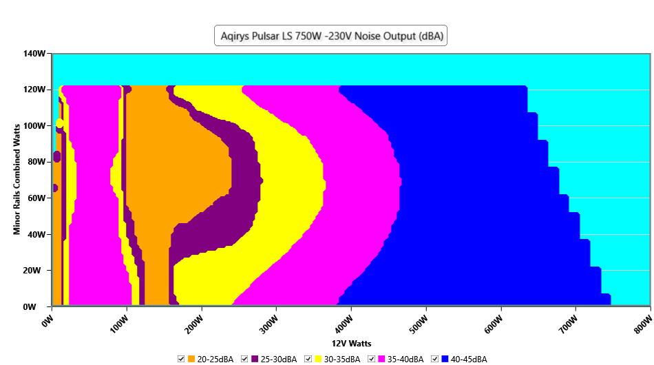 The PSU`s noise in its entire operational range and under 30-32 °C ambient is depicted in this graph. The X axis represents the load on the +12V rail(s) while the Y axis is the load on the minor rails
