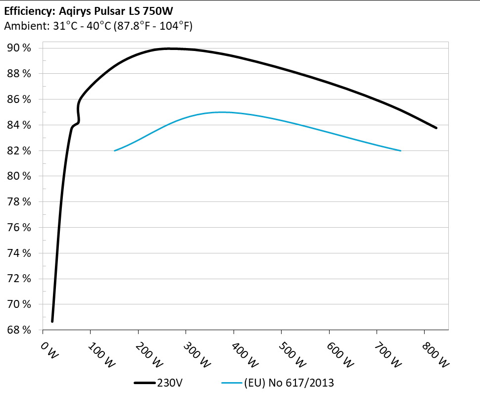 The PSU`s efficiency under high ambient temperatures with 115V and 230V input. For this graph the results of the 10-110% load regulation table are used