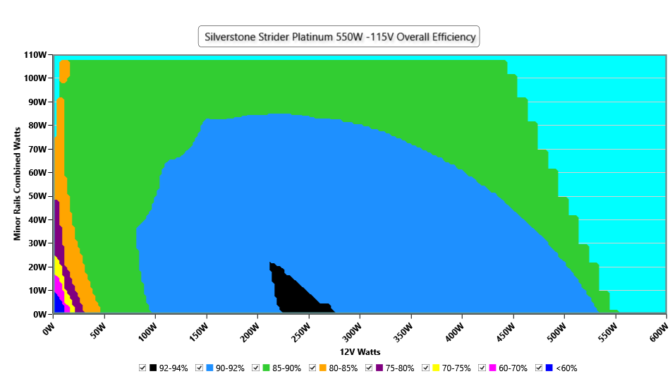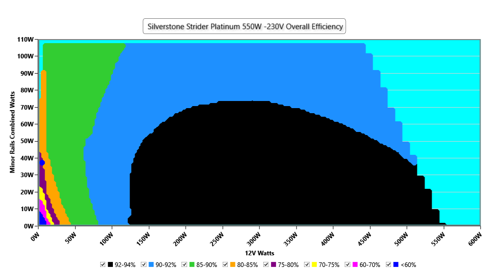 This graph depicts the PSU`s efficiency throughout its entire operational range. For the generation of the efficiency and noise graphs we set our loaders to auto mode through our custom-made software before trying thousands of possible load combinations