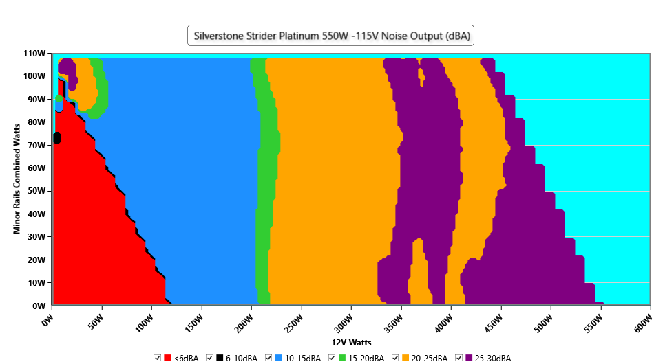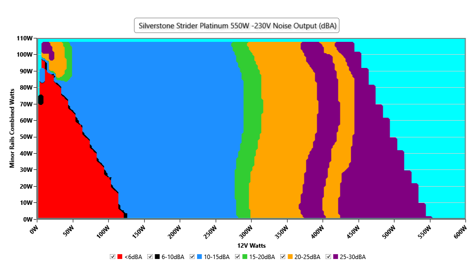 The PSU`s noise in its entire operational range and under 30-32 °C ambient is depicted in this graph. The X axis represents the load on the +12V rail(s) while the Y axis is the load on the minor rails