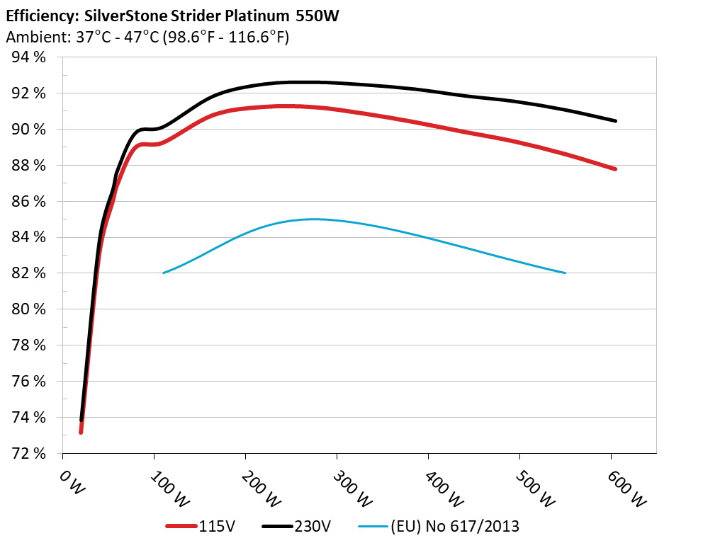 The PSU`s efficiency under high ambient temperatures with 115V and 230V input. For this graph the results of the 10-110% load regulation table are used