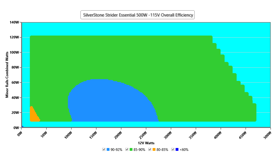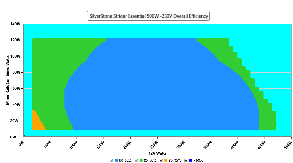 This graph depicts the PSU`s efficiency throughout its entire operational range. For the generation of the efficiency and noise graphs we set our loaders to auto mode through our custom-made software before trying thousands of possible load combinations