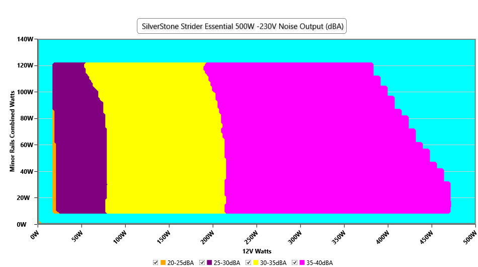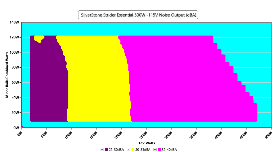 The PSU`s noise in its entire operational range and under 30-32 °C ambient is depicted in this graph. The X axis represents the load on the +12V rail(s) while the Y axis is the load on the minor rails