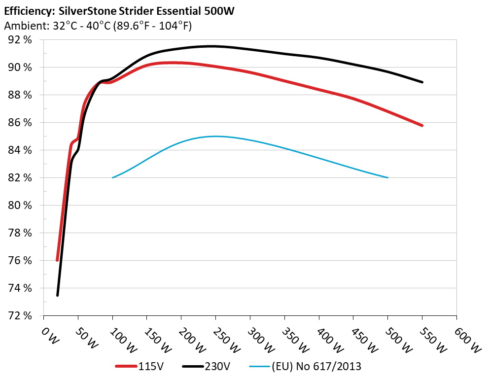 The PSU`s efficiency under high ambient temperatures with 115V and 230V input. For this graph the results of the 10-110% load regulation table are used