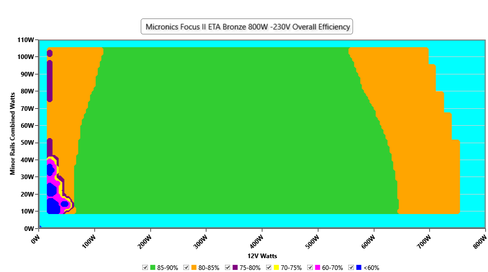 This graph depicts the PSU`s efficiency throughout its entire operational range. For the generation of the efficiency and noise graphs we set our loaders to auto mode through our custom-made software before trying thousands of possible load combinations
