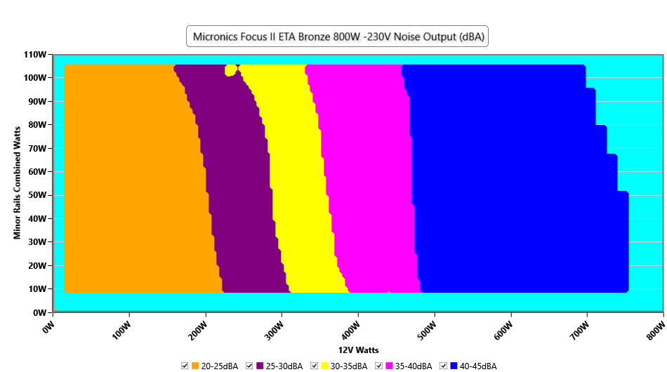 The PSU`s noise in its entire operational range and under 30-32 °C ambient is depicted in this graph. The X axis represents the load on the +12V rail(s) while the Y axis is the load on the minor rails
