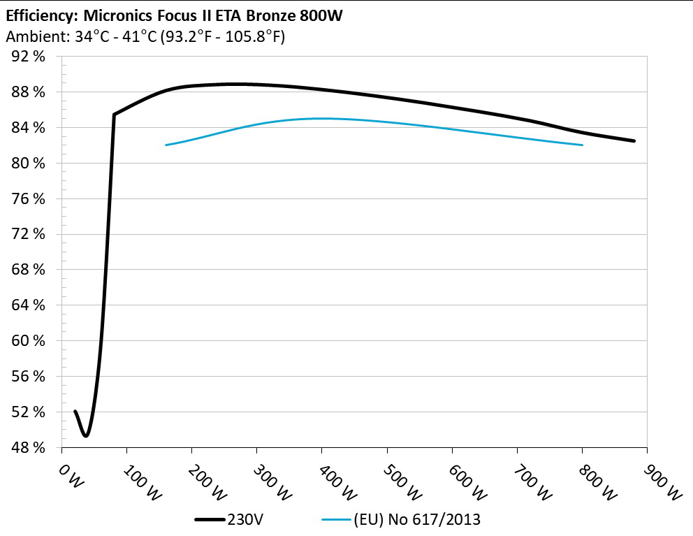 The PSU`s efficiency under high ambient temperatures with 115V and 230V input. For this graph the results of the 10-110% load regulation table are used