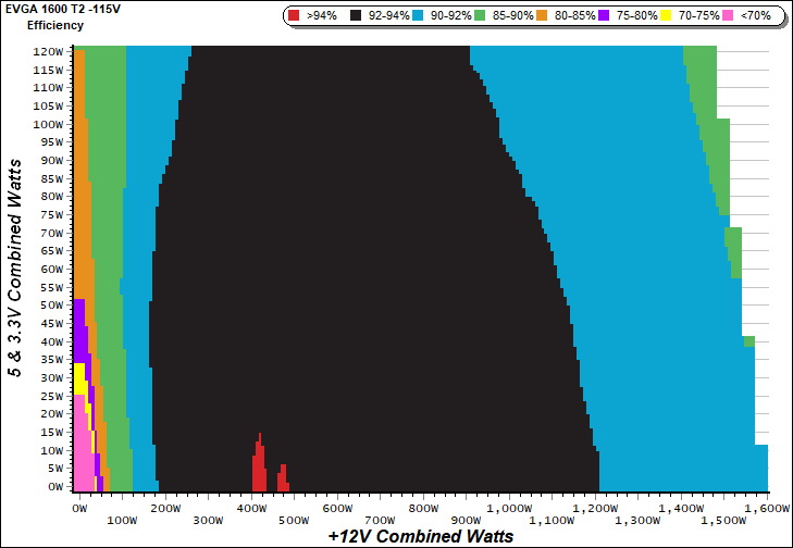 This graph depicts the PSU`s efficiency throughout its entire operational range. For the generation of the efficiency and noise graphs we set our loaders to auto mode through our custom-made software before trying thousands of possible load combinations.