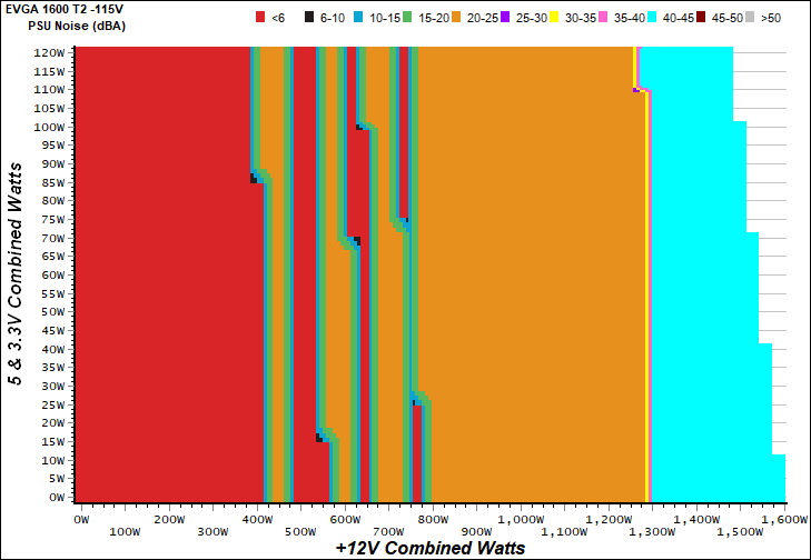 The PSU`s noise in its entire operational range and under 30-32 °C ambient is depicted in this graph. The X axis represents the load on the +12V rail(s) while the Y axis is the load on the minor rails.