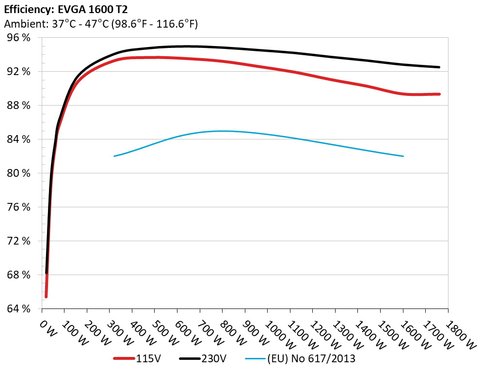 The PSU`s efficiency under high ambient temperatures with 115V and 230V input. For this graph the results of the 10-110% load regulation table are used.