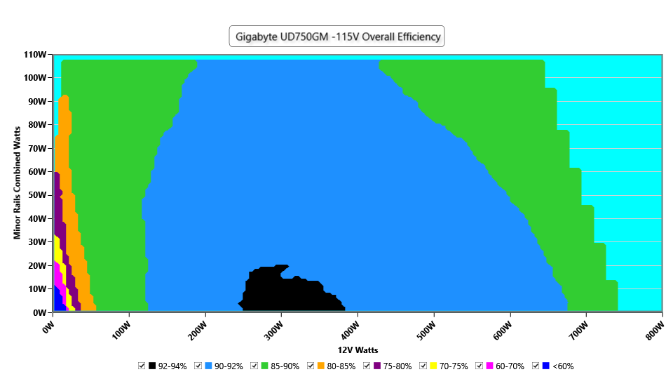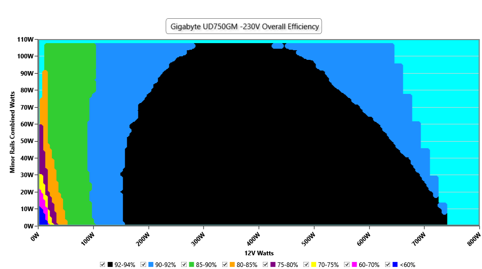This graph depicts the PSU`s efficiency throughout its entire operational range. For the generation of the efficiency and noise graphs we set our loaders to auto mode through our custom-made software before trying thousands of possible load combinations