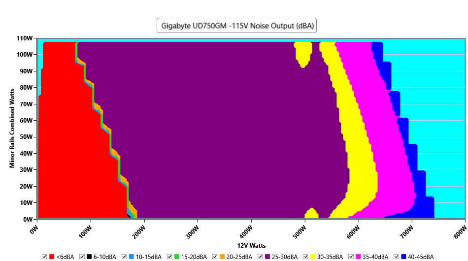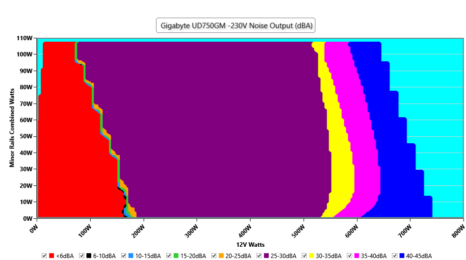 The PSU`s noise in its entire operational range and under 30-32 °C ambient is depicted in this graph. The X axis represents the load on the +12V rail(s) while the Y axis is the load on the minor rails
