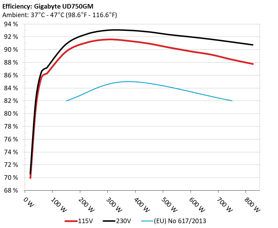 The PSU`s efficiency under high ambient temperatures with 115V and 230V input. For this graph the results of the 10-110% load regulation table are used