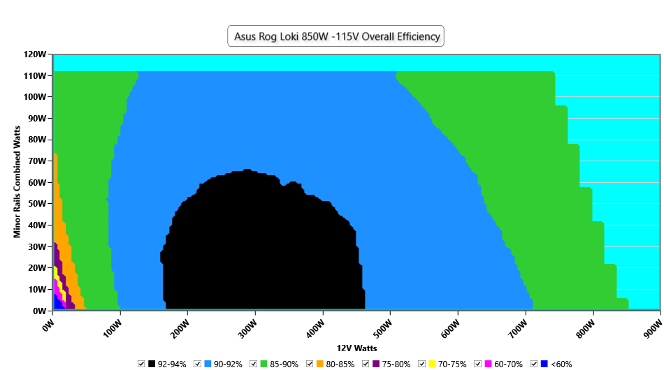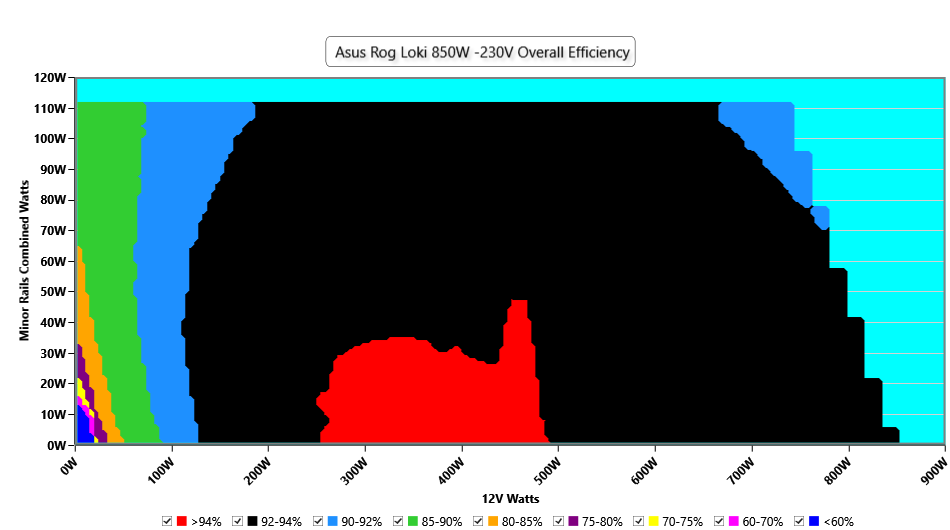This graph depicts the PSU`s efficiency throughout its entire operational range. For the generation of the efficiency and noise graphs we set our loaders to auto mode through our custom-made software before trying thousands of possible load combinations
