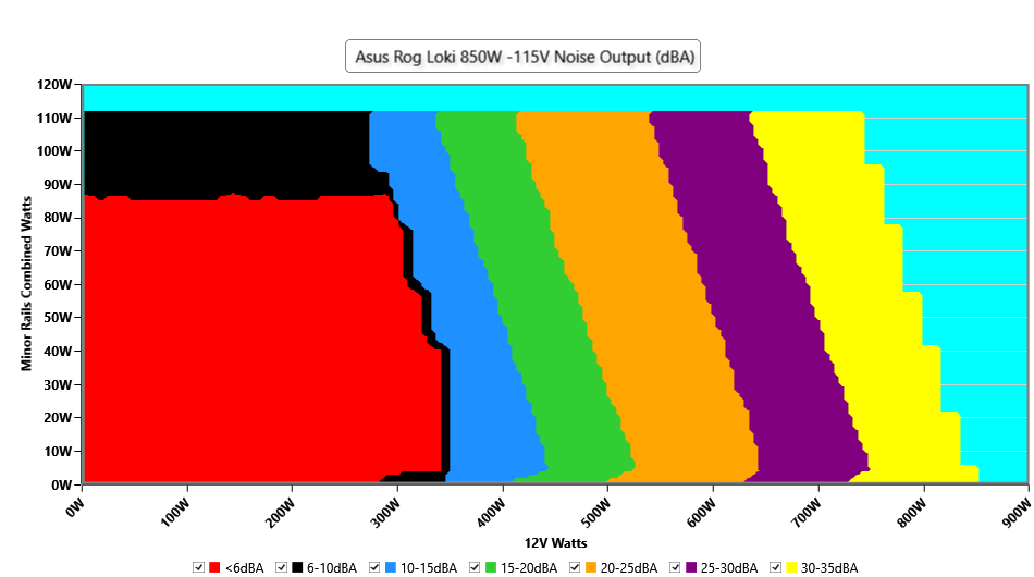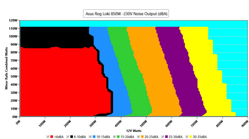 The PSU`s noise in its entire operational range and under 30-32 °C ambient is depicted in this graph. The X axis represents the load on the +12V rail(s) while the Y axis is the load on the minor rails