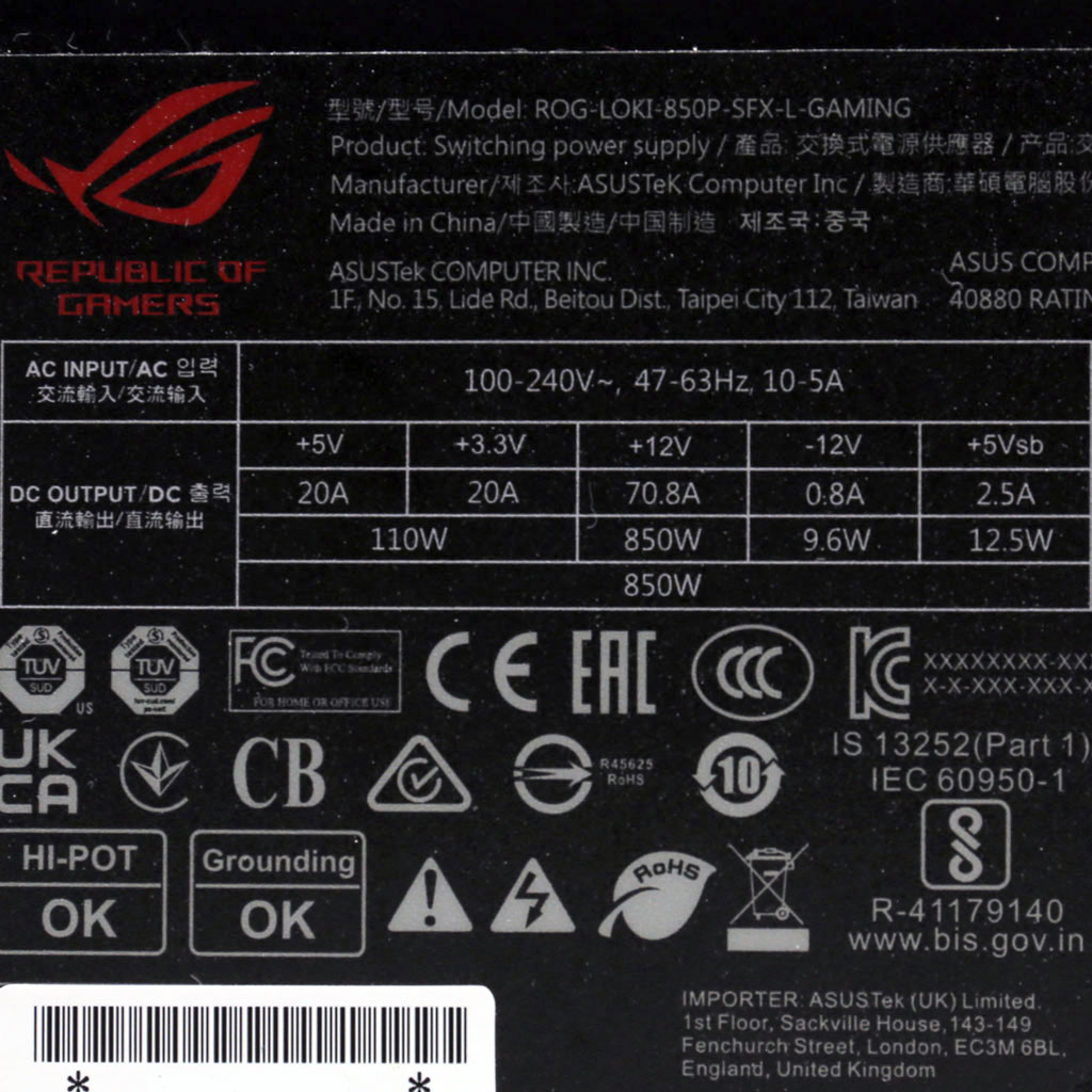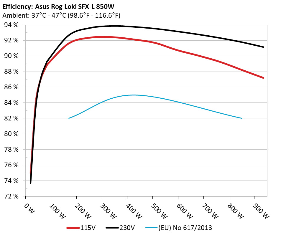 The PSU`s efficiency under high ambient temperatures with 115V and 230V input. For this graph the results of the 10-110% load regulation table are used