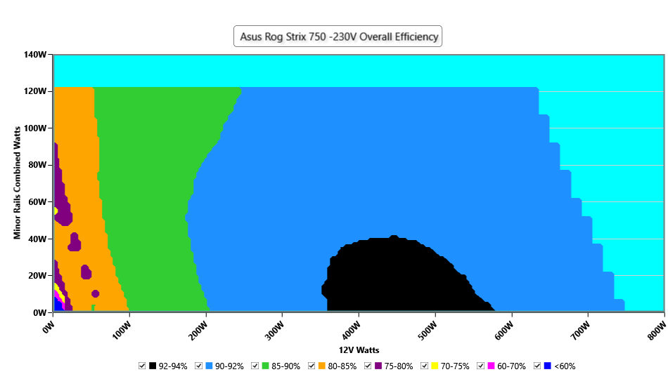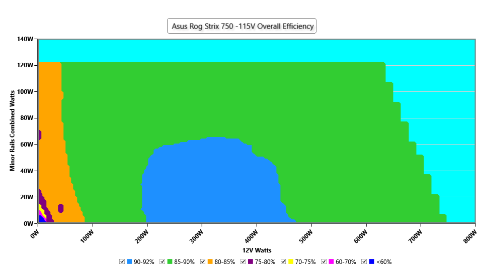 This graph depicts the PSU`s efficiency throughout its entire operational range. For the generation of the efficiency and noise graphs we set our loaders to auto mode through our custom-made software before trying thousands of possible load combinations
