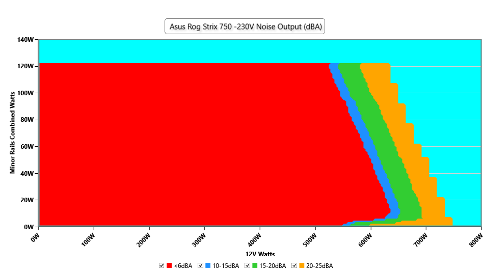 The PSU`s noise in its entire operational range and under 30-32 °C ambient is depicted in this graph. The X axis represents the load on the +12V rail(s) while the Y axis is the load on the minor rails