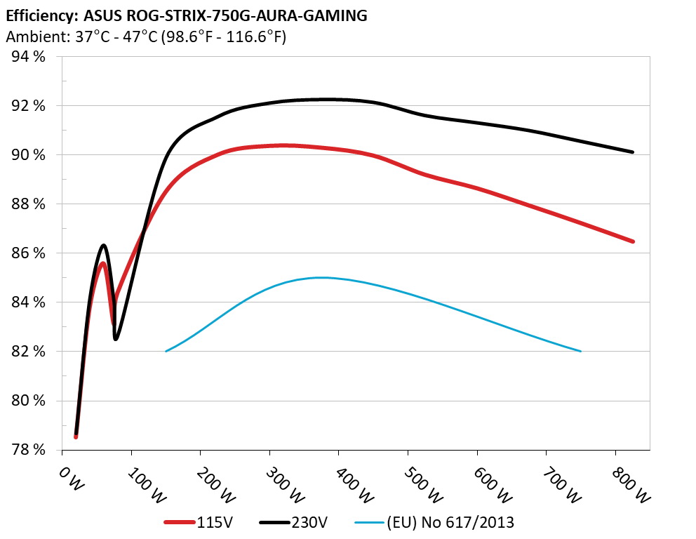 The PSU`s efficiency under high ambient temperatures with 115V and 230V input. For this graph the results of the 10-110% load regulation table are used