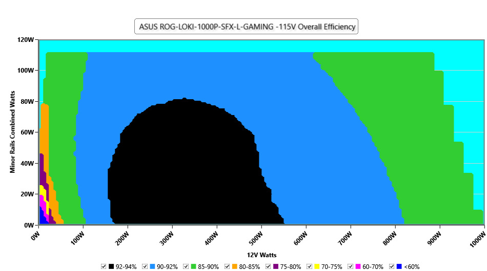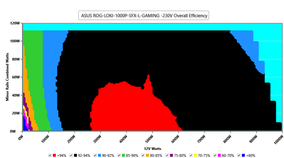 This graph depicts the PSU`s efficiency throughout its entire operational range. For the generation of the efficiency and noise graphs we set our loaders to auto mode through our custom-made software before trying thousands of possible load combinations