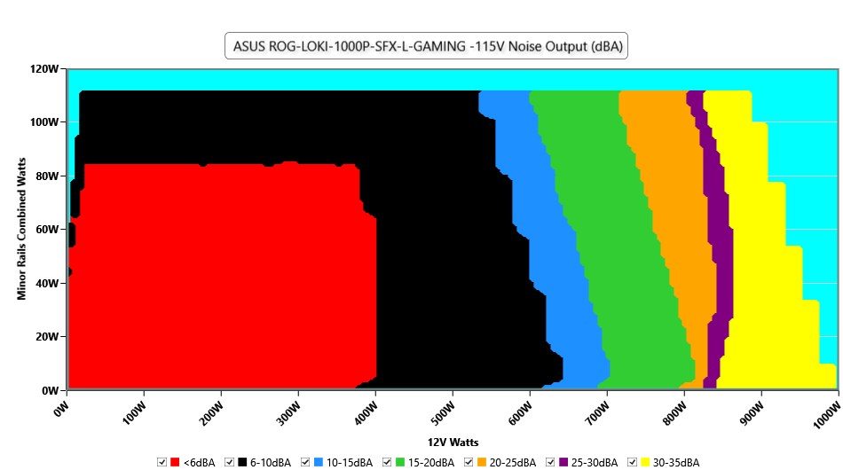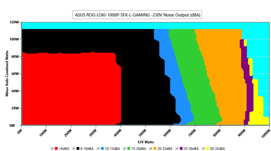 The PSU`s noise in its entire operational range and under 30-32 °C ambient is depicted in this graph. The X axis represents the load on the +12V rail(s) while the Y axis is the load on the minor rails