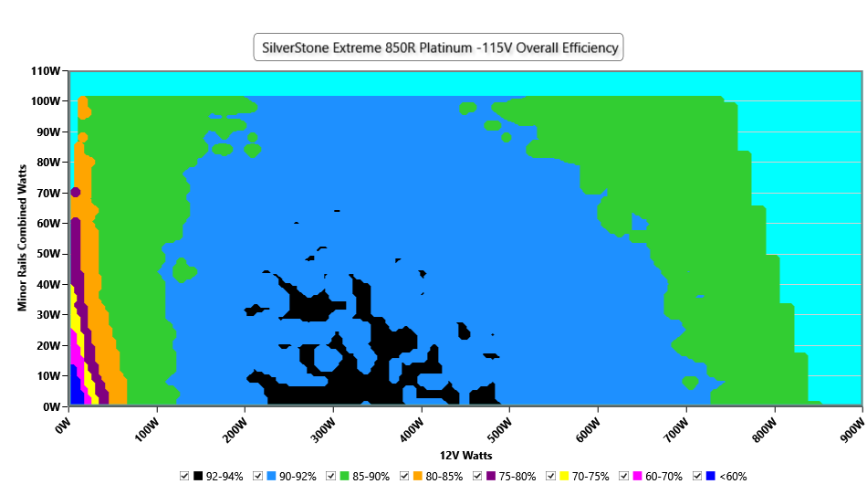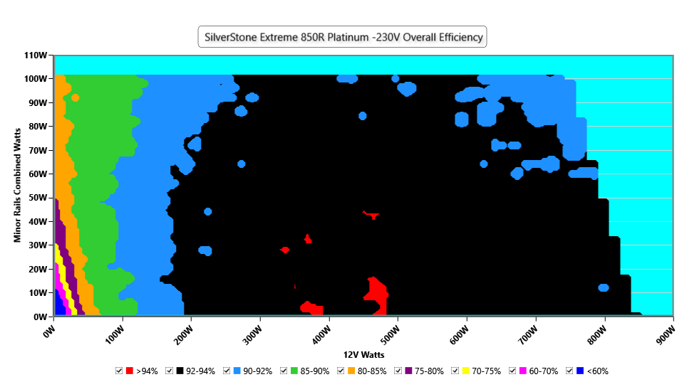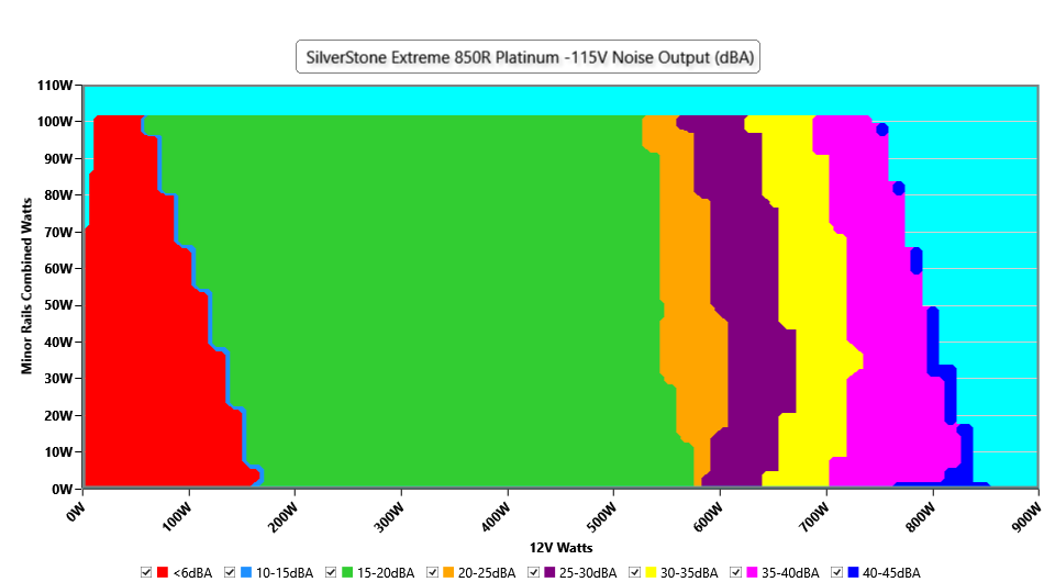 This graph depicts the PSU`s efficiency throughout its entire operational range. For the generation of the efficiency and noise graphs we set our loaders to auto mode through our custom-made software before trying thousands of possible load combinations