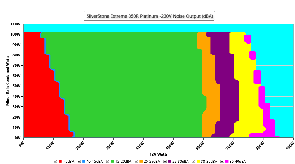 The PSU`s noise in its entire operational range and under 30-32 °C ambient is depicted in this graph. The X axis represents the load on the +12V rail(s) while the Y axis is the load on the minor rails