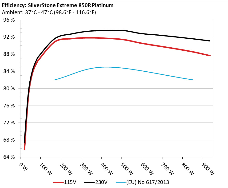 The PSU`s efficiency under high ambient temperatures with 115V and 230V input. For this graph the results of the 10-110% load regulation table are used
