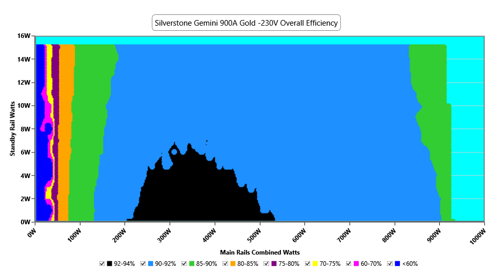 This graph depicts the PSU`s efficiency throughout its entire operational range. For the generation of the efficiency and noise graphs we set our loaders to auto mode through our custom-made software before trying thousands of possible load combinations