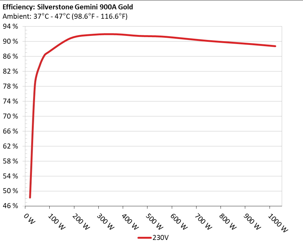 The PSU`s efficiency under high ambient temperatures with 115V and 230V input. For this graph the results of the 10-110% load regulation table are used