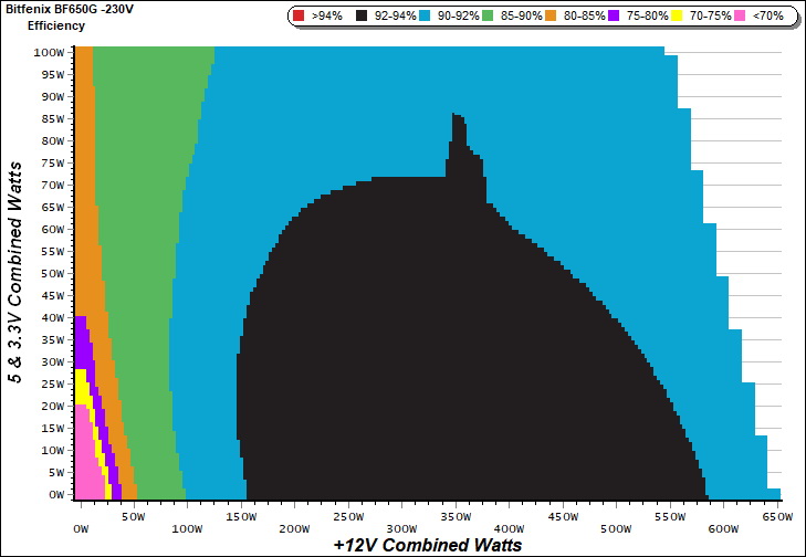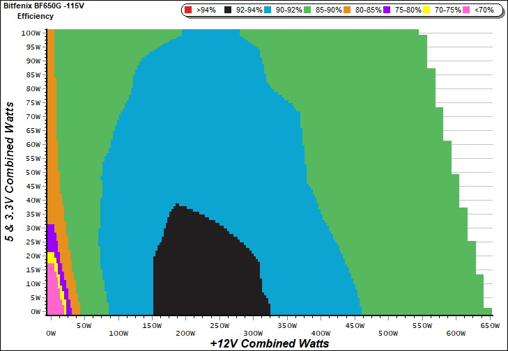 This graph depicts the PSU`s efficiency throughout its entire operational range. For the generation of the efficiency and noise graphs we set our loaders to auto mode through our custom-made software before trying thousands of possible load combinations.