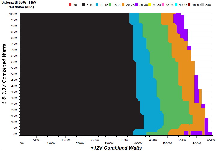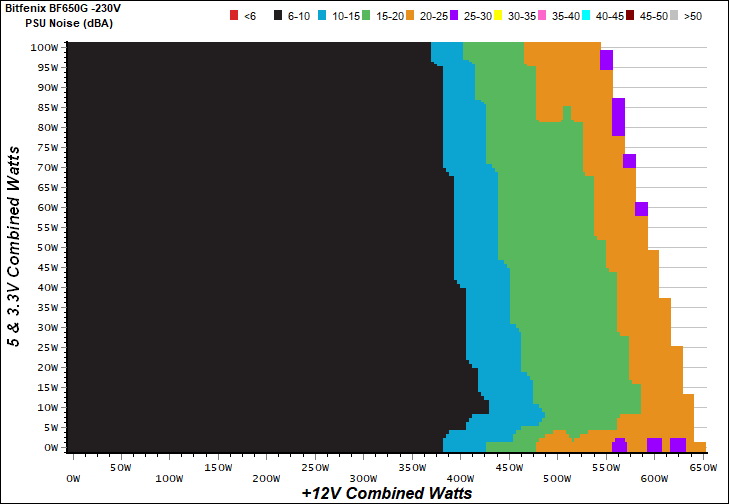 The PSU`s noise in its entire operational range and under 30-32 °C ambient is depicted in this graph. The X axis represents the load on the +12V rail(s) while the Y axis is the load on the minor rails.