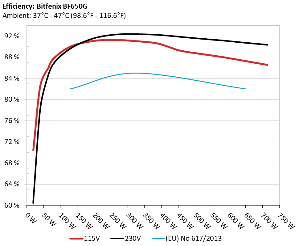 The PSU`s efficiency under high ambient temperatures with 115V and 230V input. For this graph the results of the 10-110% load regulation table are used.