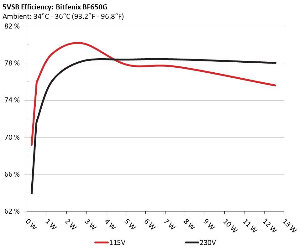 This graph depicts the efficiency levels of the 5VSB rail with 115V and 230V input.