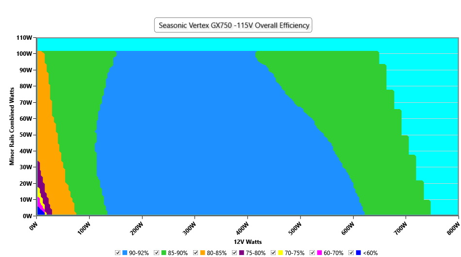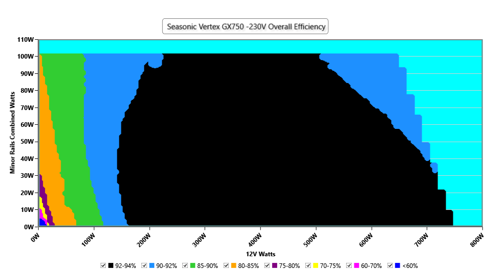 This graph depicts the PSU`s efficiency throughout its entire operational range. For the generation of the efficiency and noise graphs we set our loaders to auto mode through our custom-made software before trying thousands of possible load combinations