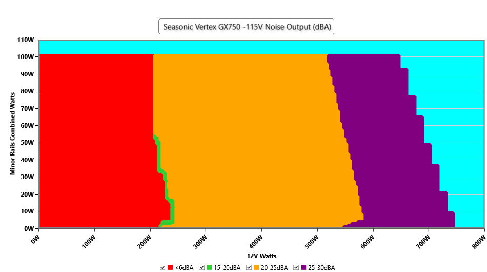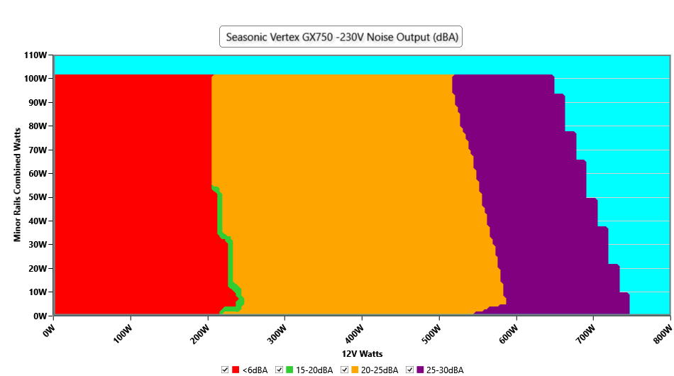 The PSU`s noise in its entire operational range and under 30-32 °C ambient is depicted in this graph. The X axis represents the load on the +12V rail(s) while the Y axis is the load on the minor rails