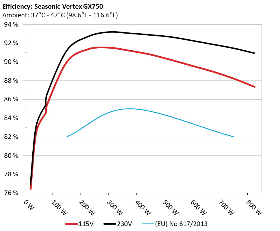 The PSU`s efficiency under high ambient temperatures with 115V and 230V input. For this graph the results of the 10-110% load regulation table are used