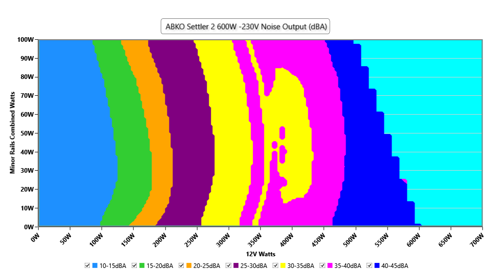 The PSU`s noise in its entire operational range and under 30-32 °C ambient is depicted in this graph. The X axis represents the load on the +12V rail(s) while the Y axis is the load on the minor rails