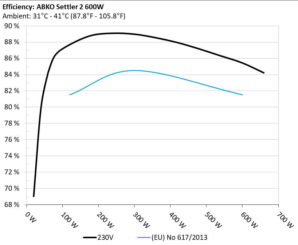 The PSU`s efficiency under high ambient temperatures with 115V and 230V input. For this graph the results of the 10-110% load regulation table are used