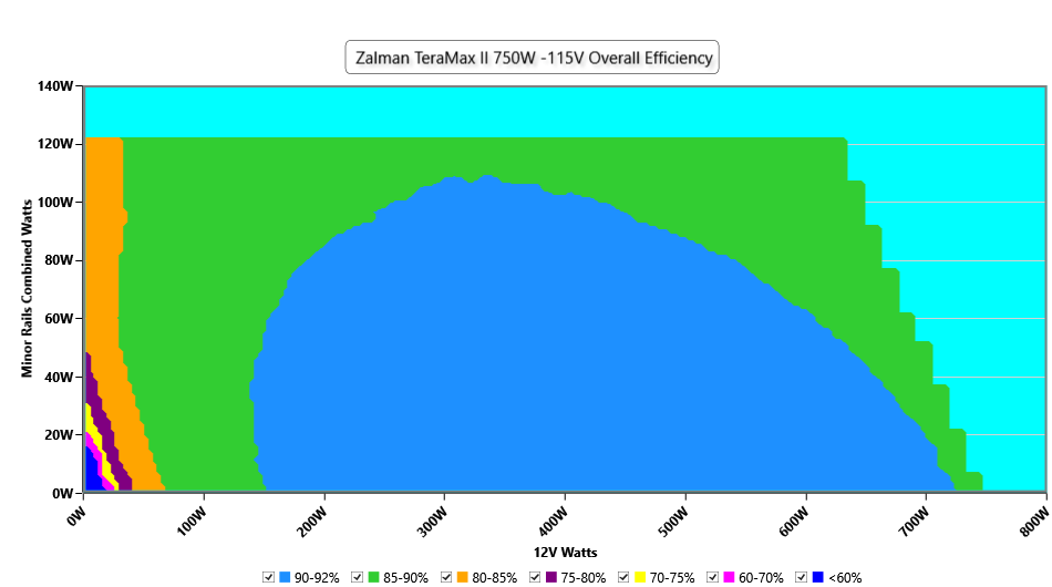 This graph depicts the PSU`s efficiency throughout its entire operational range. For the generation of the efficiency and noise graphs we set our loaders to auto mode through our custom-made software before trying thousands of possible load combinations