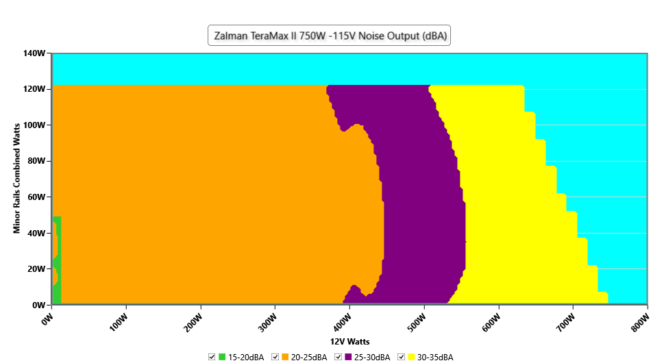 The PSU`s noise in its entire operational range and under 30-32 °C ambient is depicted in this graph. The X axis represents the load on the +12V rail(s) while the Y axis is the load on the minor rails