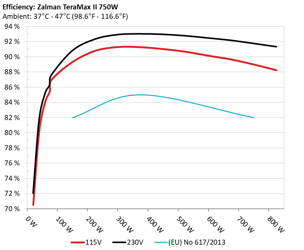 The PSU`s efficiency under high ambient temperatures with 115V and 230V input. For this graph the results of the 10-110% load regulation table are used