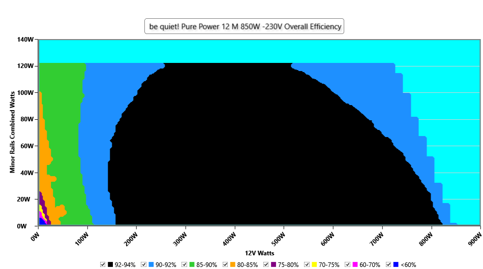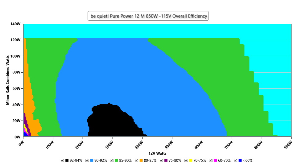 This graph depicts the PSU`s efficiency throughout its entire operational range. For the generation of the efficiency and noise graphs we set our loaders to auto mode through our custom-made software before trying thousands of possible load combinations