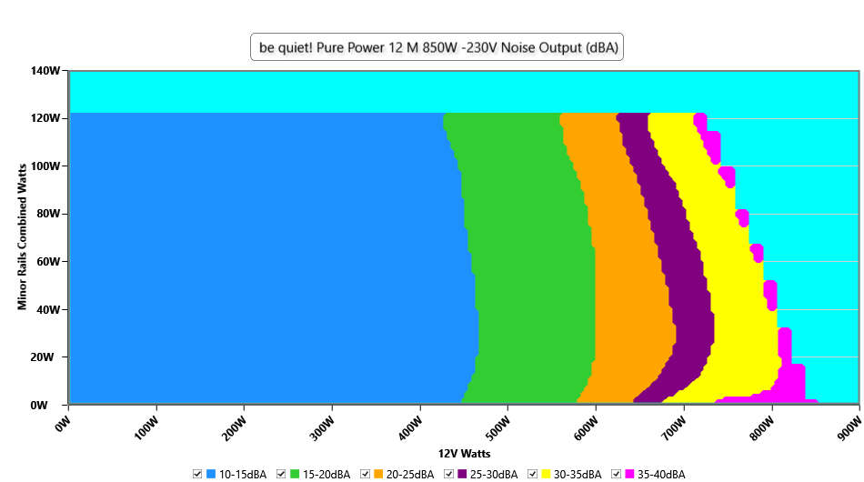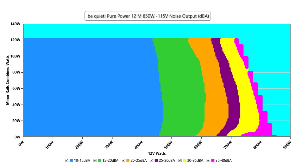 The PSU`s noise in its entire operational range and under 30-32 °C ambient is depicted in this graph. The X axis represents the load on the +12V rail(s) while the Y axis is the load on the minor rails