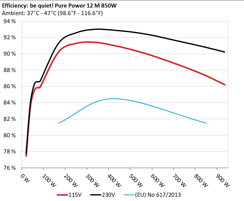The PSU`s efficiency under high ambient temperatures with 115V and 230V input. For this graph the results of the 10-110% load regulation table are used