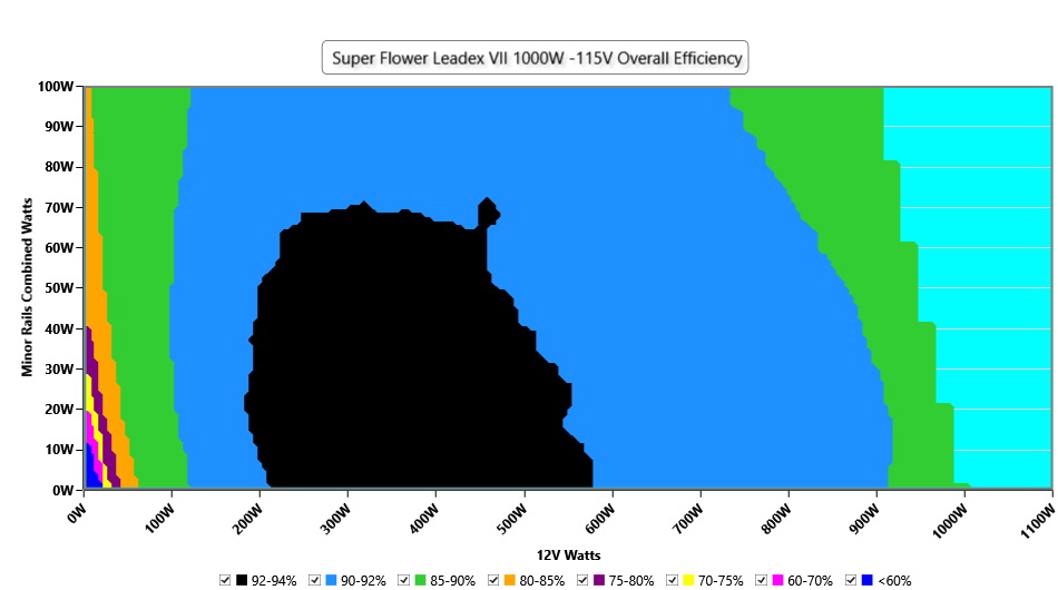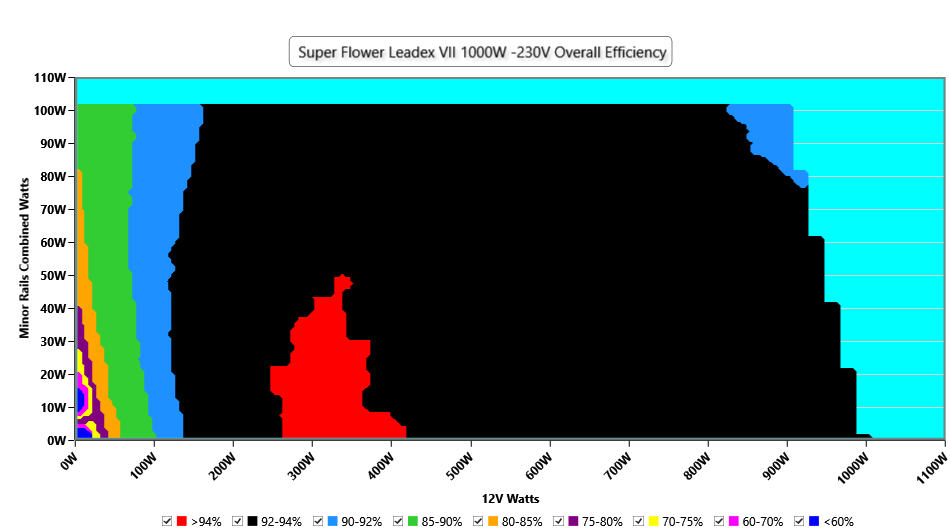 This graph depicts the PSU`s efficiency throughout its entire operational range. For the generation of the efficiency and noise graphs we set our loaders to auto mode through our custom-made software before trying thousands of possible load combinations