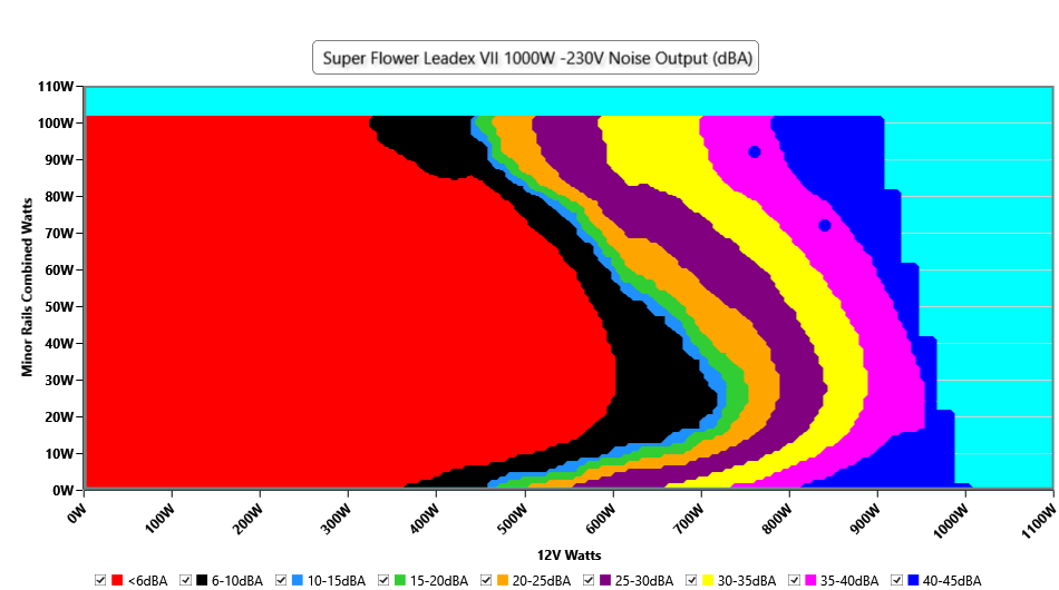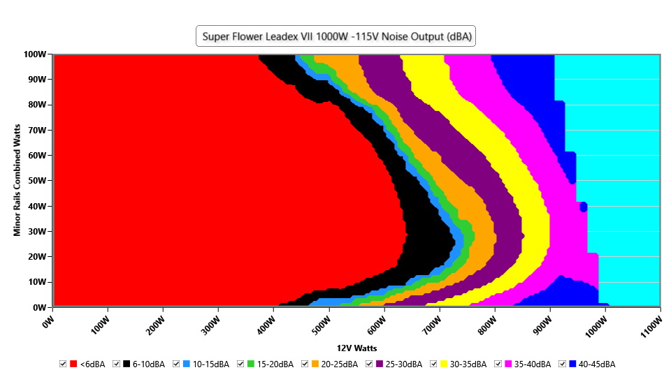 The PSU`s noise in its entire operational range and under 30-32 °C ambient is depicted in this graph. The X axis represents the load on the +12V rail(s) while the Y axis is the load on the minor rails