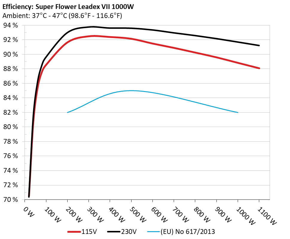 The PSU`s efficiency under high ambient temperatures with 115V and 230V input. For this graph the results of the 10-110% load regulation table are used