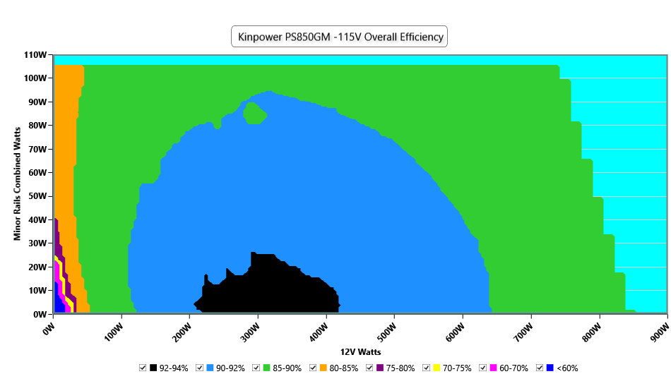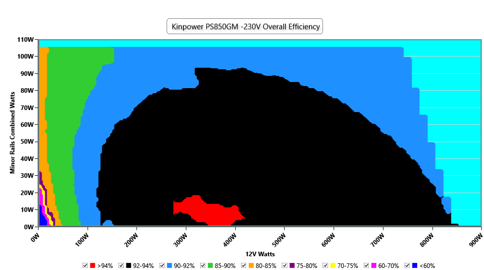 This graph depicts the PSU`s efficiency throughout its entire operational range. For the generation of the efficiency and noise graphs we set our loaders to auto mode through our custom-made software before trying thousands of possible load combinations