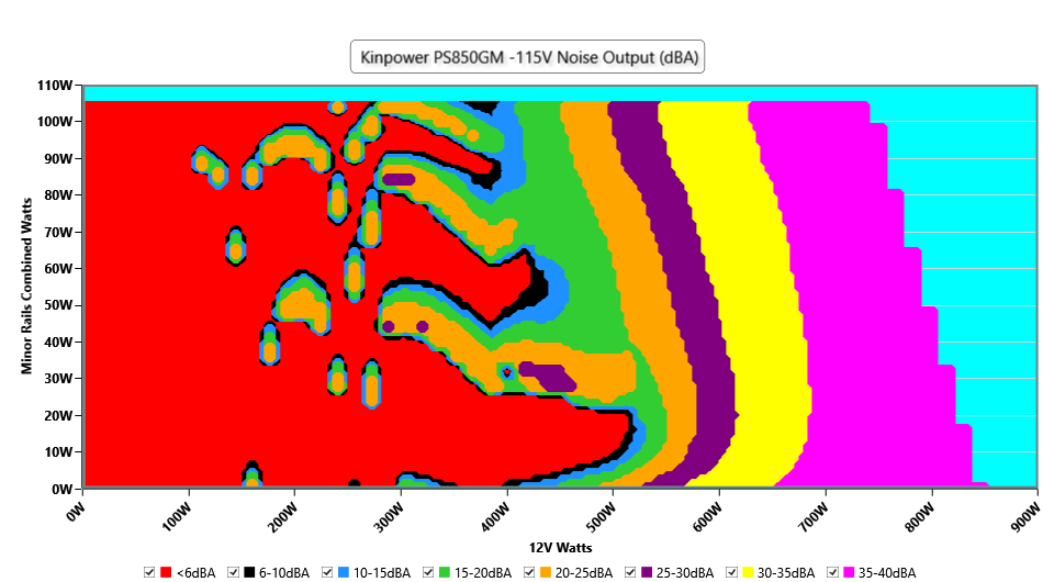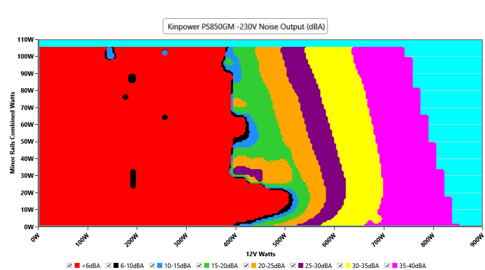 The PSU`s noise in its entire operational range and under 30-32 °C ambient is depicted in this graph. The X axis represents the load on the +12V rail(s) while the Y axis is the load on the minor rails